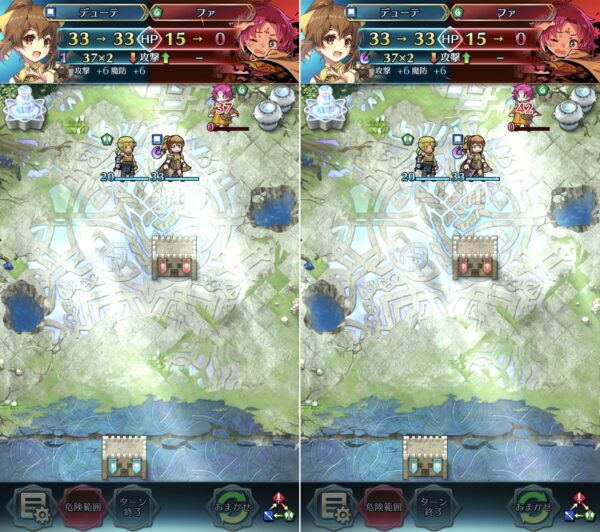 左が祈り未チャージで37ダメ、右が祈りチャージ済みで42ダメ